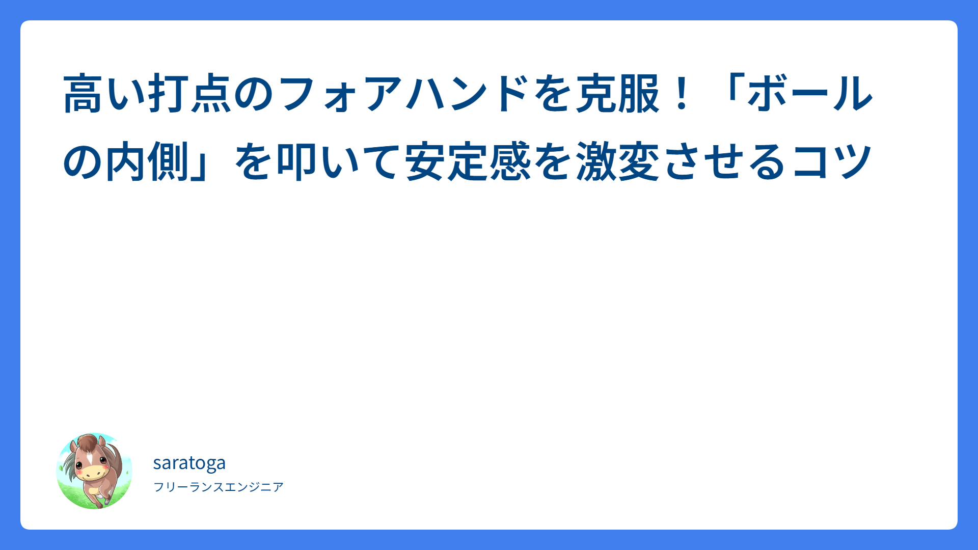 ボールとの距離感が劇的に変わる!「ボールの内側」を見る新常識とクワイエットアイの魔法 2026.02.06 ストローク saratogax サラトガ牧場 高い打点のフォアハンドを克服!「ボールの内側」を叩いて安定感を激変させるコツ 2026.02.05 ストローク saratogax サラトガ牧場 打点が近くて詰まる悩みを解消!プロが教える「軸足の入り方」3ステップ 2026.02.04 ストローク saratogax サラトガ牧場 【ストローク安定の極意】上手い人が無意識にやっている「一瞬のタメ」を作る方法 2026.02.04 ストローク saratogax サラトガ牧場 【AWS神アプデ】RDS/Auroraのブルー/グリーンデプロイが進化!ダウンタイム5秒以下の衝撃 2026.02.04 技術系TIPS saratogax サラトガ牧場 DatadogでALBを監視するなら知っておきたい!httpcode_elb_4xx と httpcode_target_4xx の決定的な違い 2026.02.04 技術系TIPS saratogax サラトガ牧場 【フォアハンド】脱力こそが正解!インパクトで力を抜いて「ヘッドを走らせる」極意 2026.02.04 ストローク saratogax サラトガ牧場 【2026年最新】ヨネックス VCORE 100 を徹底解説!驚異のパワーとスピン性能の秘密とは? 2026.02.04 テニスアイテム saratogax サラトガ牧場 サーブが劇的に変わる!「構え」と「意識」の共通点とは?初心者を脱却する3つの極意 2026.02.04 サーブ saratogax サラトガ牧場 【ダブルス必見】センターロブの処理で迷わない!ペアとの連携を深める「鉄則」と「カバーのコツ」 2026.02.03 戦術(ダブルス、ポーチ) saratogax サラトガ牧場 もっと見る