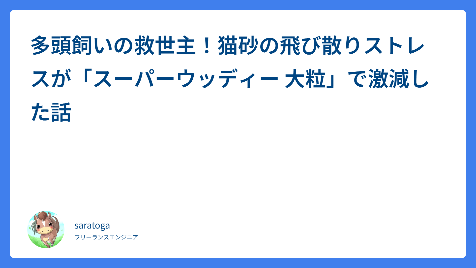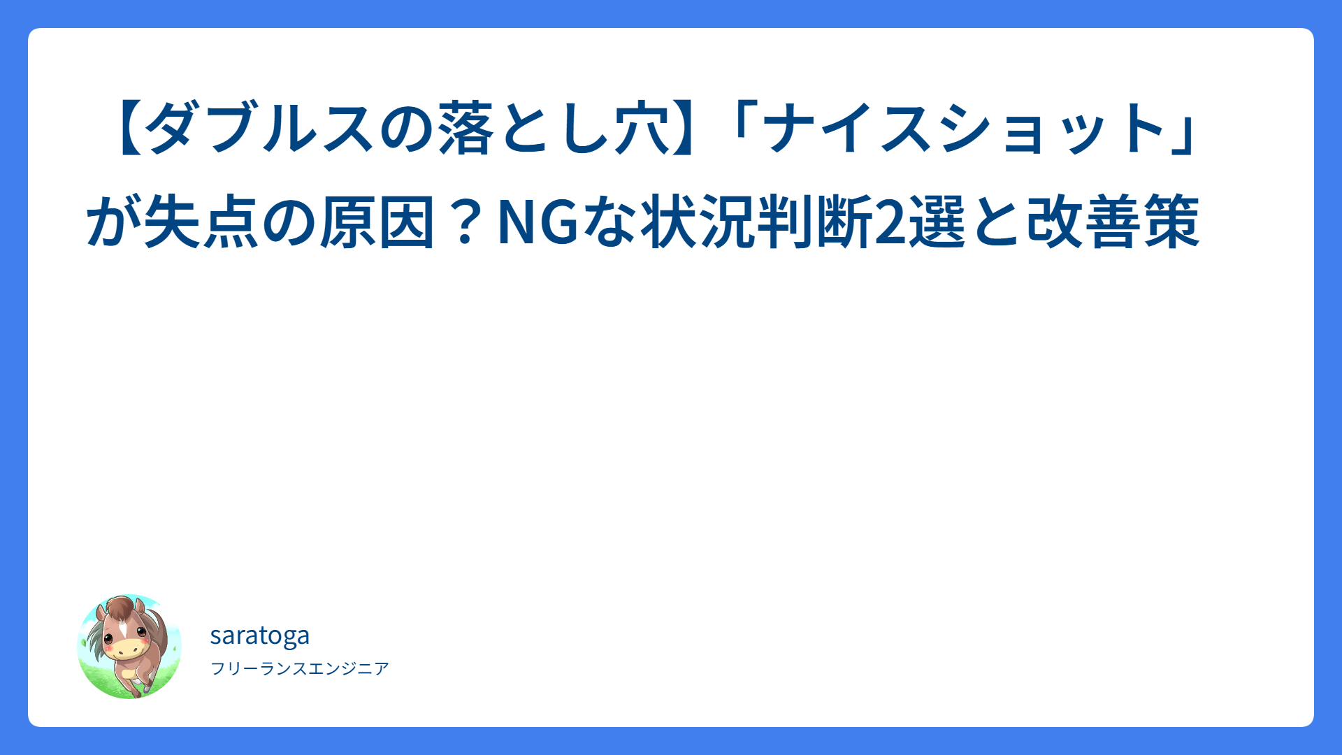 多頭飼いの救世主!猫砂の飛び散りストレスが「スーパーウッディー 大粒」で激減した話 2026.02.17 動物 saratogax サラトガ牧場 【ダブルスの落とし穴】「ナイスショット」が失点の原因?NGな状況判断2選と改善策 2026.02.16 戦術(ダブルス、ポーチ) saratogax サラトガ牧場 センス不要!お馴染みのポーズで覚える大人の簡単ボレー上達法 2026.02.15 ボレー saratogax サラトガ牧場 ボレーが劇的に安定する!プロも実践する「意味のある」ボレーボレー練習法 2026.02.15 ボレー saratogax サラトガ牧場 【鉄壁の守り】相手に「打つところがない!」と思わせる平行陣の上達ステップ 2026.02.14 戦術(ダブルス、ポーチ) saratogax サラトガ牧場 テニス上達の鍵!手首の角度(背屈)は作るもの?勝手にできるもの?プロが教える理想の使い方 2026.02.13 ストローク saratogax サラトガ牧場 フォアハンドが詰まる原因はこれ!打点の近さを一瞬で解決する「ボールへの入り方」の極意 2026.02.13 ストローク saratogax サラトガ牧場 テニスで「ボールとの距離」が取れない原因はこれ!90%の人ができていない解決フットワーク術 2026.02.12 ストローク saratogax サラトガ牧場 【脱・初心者】なぜあのペアは崩れない?強い平行陣が隠している「3つの秘密」を徹底解説! 2026.02.12 戦術(ダブルス、ポーチ) saratogax サラトガ牧場 【2026年版】AI開発ツールの新常識:ChatGPT-codex, Opus 4.6, Cursorをどう使い分けるか 2026.02.11 AI(Tips) saratogax サラトガ牧場 もっと見る