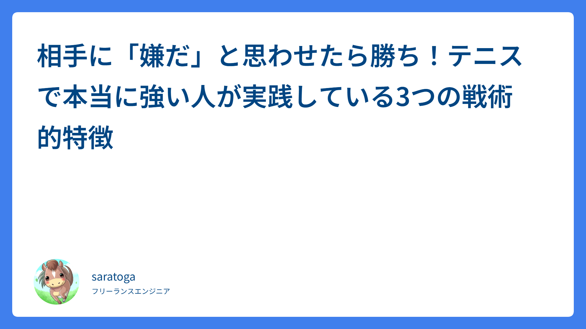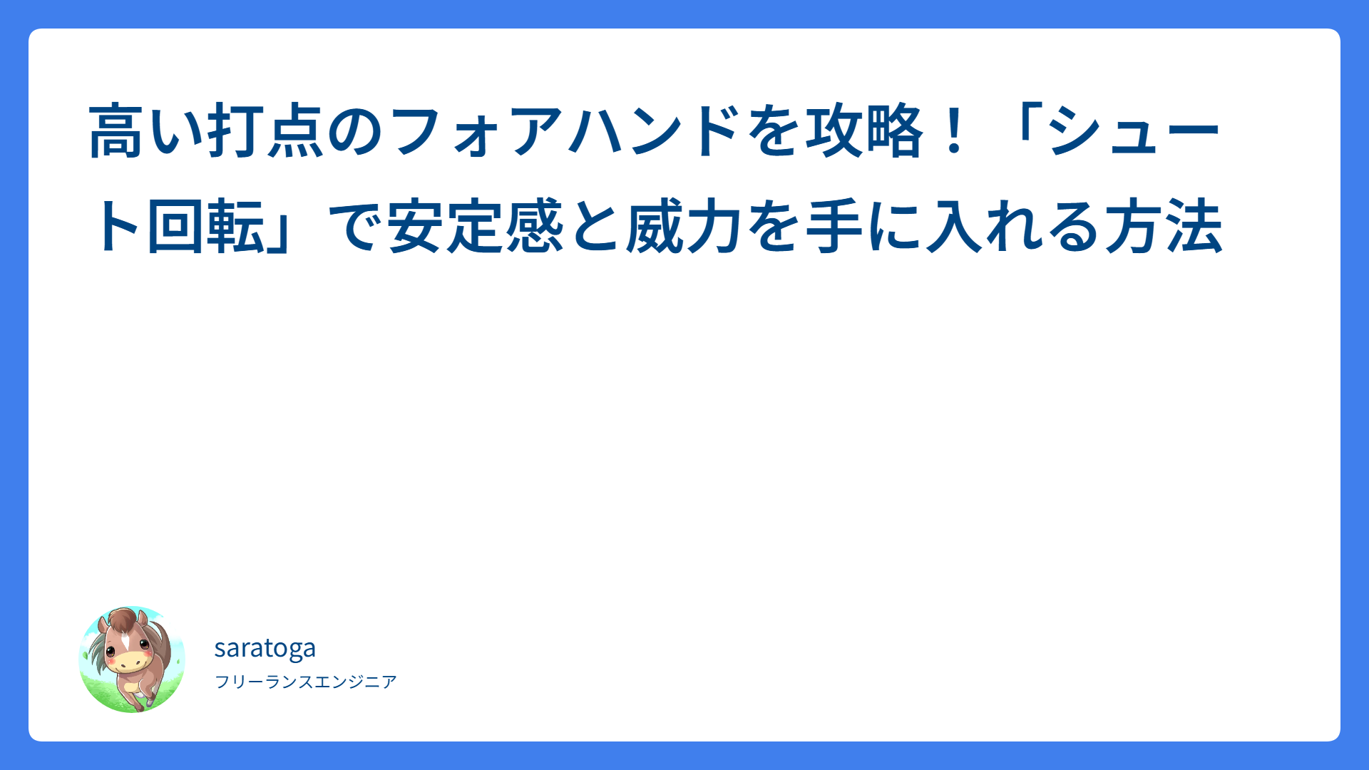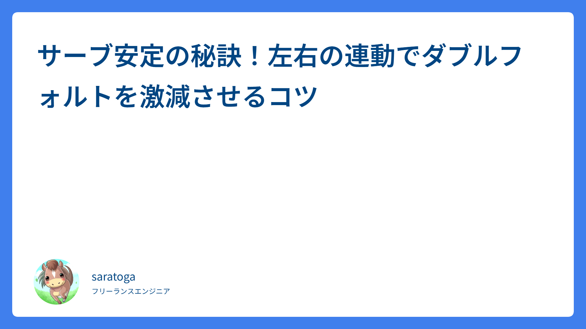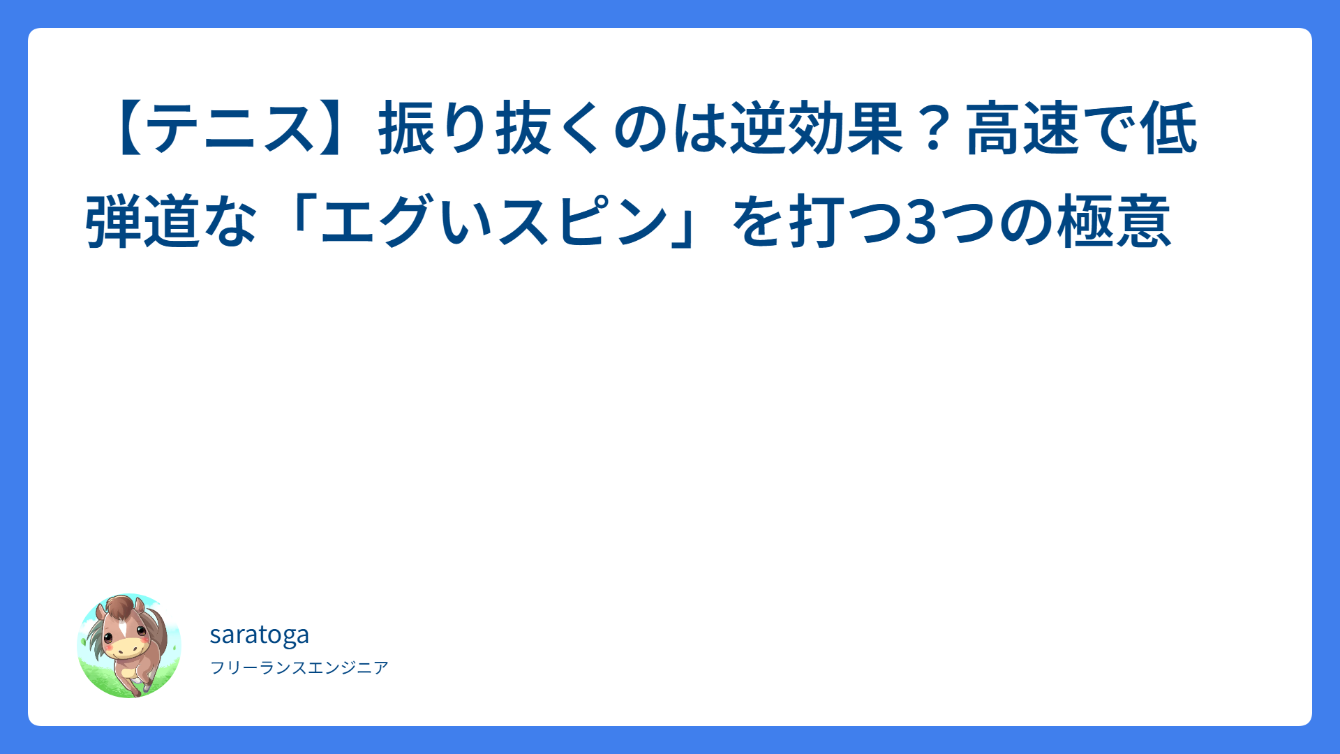 【テニス】振り抜くのは逆効果?高速で低弾道な「エグいスピン」を打つ3つの極意 2026.02.23 ストローク saratogax サラトガ牧場 ボレーが劇的に安定する!上手い人だけが実践している「待つ」の本当の意味とは? 2026.02.21 ボレー saratogax サラトガ牧場 Claude Code の新機能「Skills」とは? Gemini の Gems と何が違うのか徹底比較 2026.02.19 AI(Tips) saratogax サラトガ牧場 シングルスで負けない!追い込まれた時の「鉄板セオリー」と勝率を上げるイメトレ術 2026.02.18 テニス動画レッスン saratogax サラトガ牧場 Aurora MySQL 3.12.0 登場!LTS版 3.10.3 からアップグレードすべきか?徹底比較ガイド 2026.02.18 技術系(Tips) saratogax サラトガ牧場 【鉄壁の平行陣】ロブ追いを極めて守備力を爆上げ!プロが教える4つの秘訣 2026.02.17 戦術(ダブルス、ポーチ) saratogax サラトガ牧場 【解決】Google Play Billing で 409 エラー!acknowledge 失敗を防ぐ AWS SQS 活用術 2026.02.17 技術系(Tips) saratogax サラトガ牧場 多頭飼いの救世主!猫砂の飛び散りストレスが「スーパーウッディー 大粒」で激減した話 2026.02.17 動物 saratogax サラトガ牧場 【ダブルスの落とし穴】「ナイスショット」が失点の原因?NGな状況判断2選と改善策 2026.02.16 戦術(ダブルス、ポーチ) saratogax サラトガ牧場 センス不要!お馴染みのポーズで覚える大人の簡単ボレー上達法 2026.02.15 ボレー saratogax サラトガ牧場 もっと見る