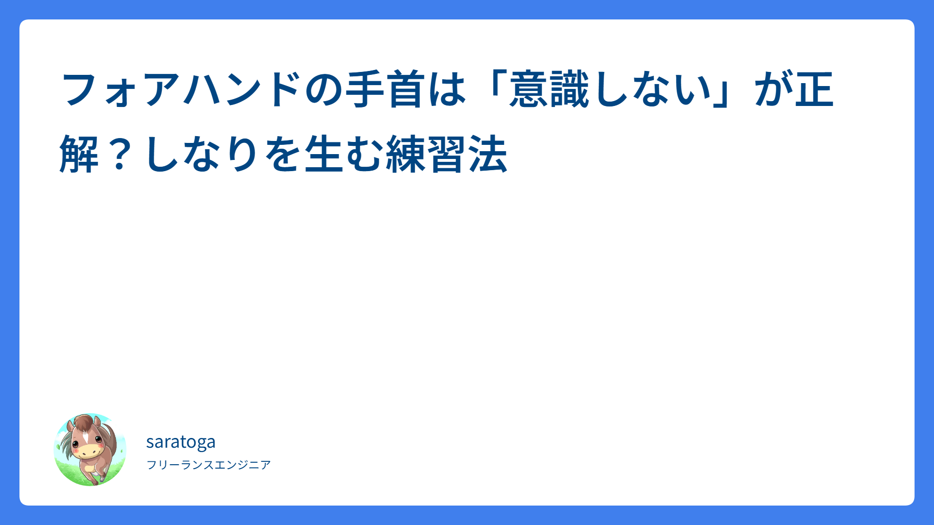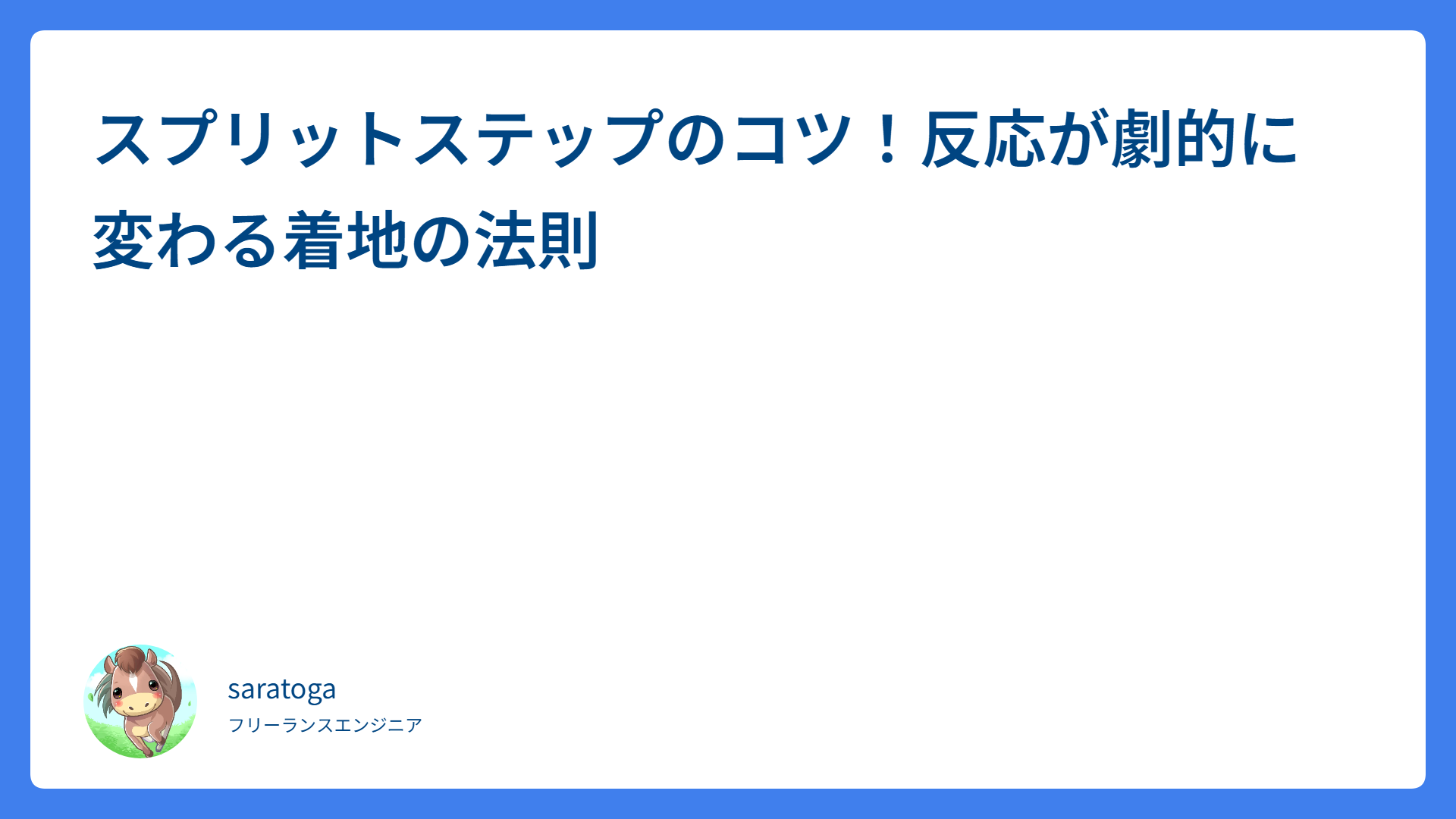 スプリットステップのコツ!反応が劇的に変わる着地の法則 2026.03.02 戦術(ダブルス、ポーチ) saratogax サラトガ牧場 フォアハンドの手首は「意識しない」が正解?しなりを生む練習法 2026.03.02 ストローク saratogax サラトガ牧場 フォアハンドが劇的に安定!感覚を味方にする3つの上達のコツ 2026.03.02 ストローク saratogax サラトガ牧場 北摂エリアのテニススクール13校を徹底比較!【2026年最新】 2026.03.01 テニススクール saratogax サラトガ牧場 【屋外テニス必携】中年男性こそ日焼け止めを!目にしみにくくベタつかない「HOLO BELL」使用レビュー 2026.02.27 テニスアイテム saratogax サラトガ牧場 ボレーの突っ込み癖を治す!「待つ」感覚を掴む歩行練習法 2026.02.27 ボレー・スマッシュ saratogax サラトガ牧場 【2026年最新】茨木市の市営テニスコート全8施設を徹底比較|料金・アクセス・予約方法まとめ 2026.02.27 テニスコート saratogax サラトガ牧場 スマッシュを武器にする!ミスを防いでチャンスを確実に決める極意 2026.02.27 ボレー・スマッシュ saratogax サラトガ牧場 【2026年最新】豊中市の市営テニスコート全5施設を徹底比較|料金・アクセス・予約方法まとめ 2026.02.27 テニスコート saratogax サラトガ牧場 【2026年最新】吹田市の市営テニスコート全4施設を徹底比較|料金・アクセス・予約方法まとめ 2026.02.26 テニスコート saratogax サラトガ牧場 もっと見る