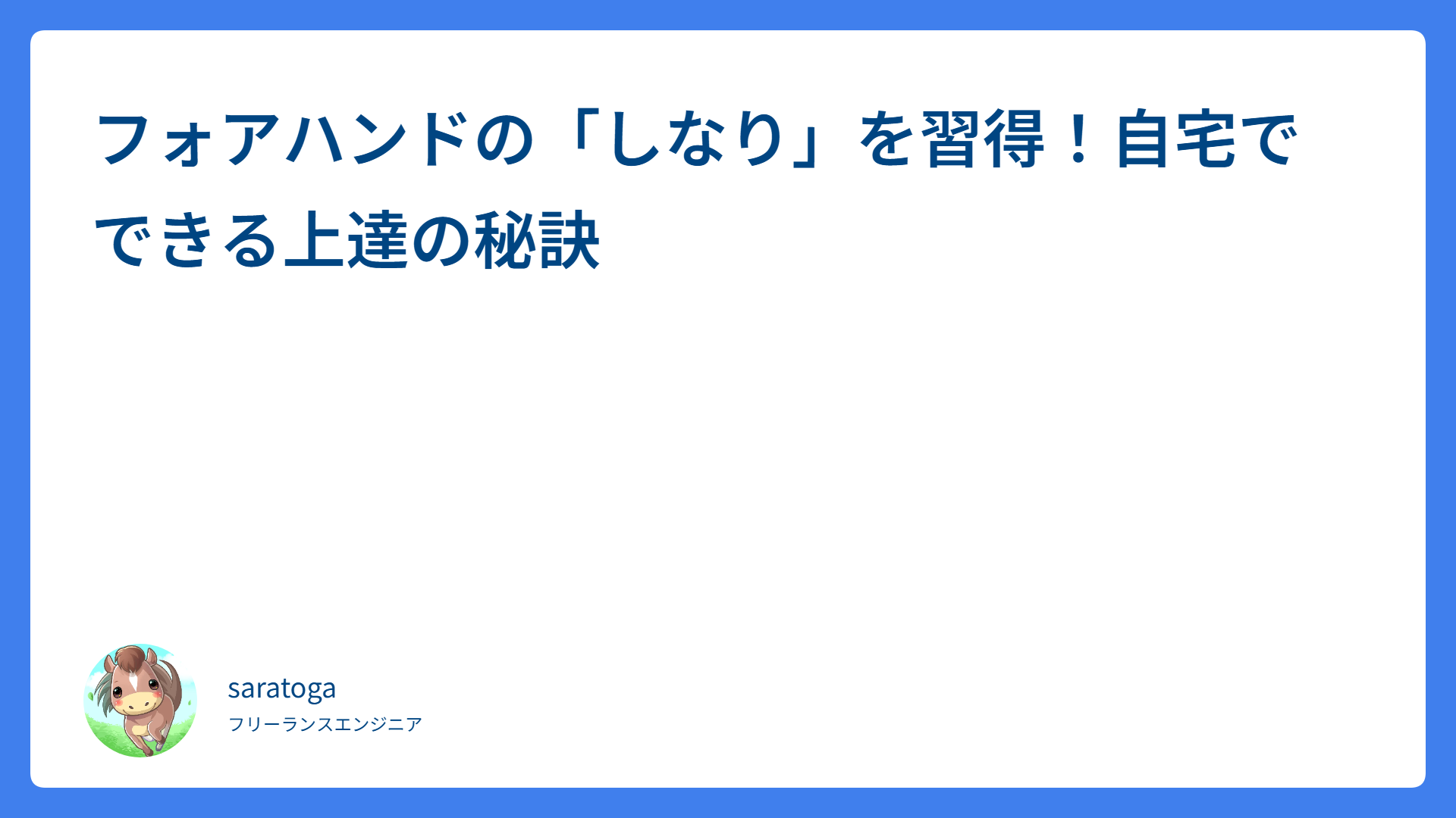フォルト激減!大人のための「センス不要」サーブ改善法 2026.03.07 サーブ saratogax サラトガ牧場 フォアハンドが劇的に変わる!手打ちを防ぐ体の使い方とテイクバック 2026.03.07 ストローク saratogax サラトガ牧場 フォアハンド上達!「腰を回す」が危険な理由と正しい体の使い方 2026.03.06 ストローク saratogax サラトガ牧場 ボレー上達の3ステップ!無駄を省いて安定させるコツ 2026.03.06 ボレー・スマッシュ saratogax サラトガ牧場 フォアハンドの「しなり」を自宅で習得!ベッドの上でできる練習法 2026.03.05 ストローク saratogax サラトガ牧場 週1テニスでも最速上達!動画では見えない3つの実践コツ 2026.03.05 テニス動画レッスン saratogax サラトガ牧場 フォアハンドが変わる!左手使い方の正解と上達のタイミング 2026.03.04 ストローク saratogax サラトガ牧場 フォアの「体を開くな」の正体!加速を生む正しい体の回し方 2026.03.04 ストローク saratogax サラトガ牧場 AWS BackupでRDS(Aurora)を別アカウントへ集約管理する:KMS再暗号化(2段階コピー)と命名規約のベストプラクティス 2026.03.04 技術系(Tips) saratogax サラトガ牧場 テニス肘を防ぐ打ち方|プロが教える「腕に頼らない」極意 2026.03.04 テニスアイテム saratogax サラトガ牧場 もっと見る