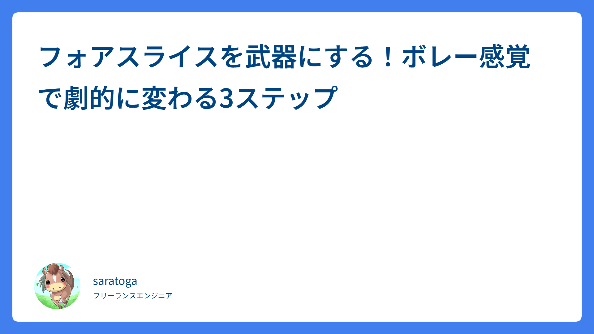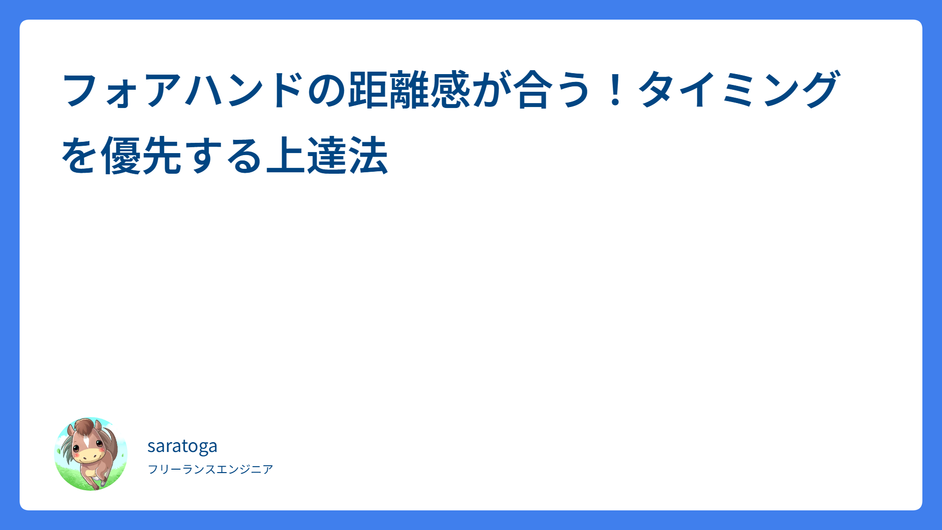 フォアハンドが変わる!オープンスタンス活用術 2026.03.11 ストローク saratogax サラトガ牧場 テニス前の7分新習慣!馬場早莉プロ直伝の動的ストレッチ 2026.03.10 ウォーミングアップ saratogax サラトガ牧場 【テニス】サーブのフォルト激減!大人向け3つの安定化ステップ 2026.03.07 サーブ saratogax サラトガ牧場 フォアハンドが劇的に変わる!力みを抑えて効率よく飛ばす3つのコツ 2026.03.07 脱力 saratogax サラトガ牧場 フォアハンドは腰を回さない!股関節で飛ばす上達のコツ 2026.03.06 ストローク saratogax サラトガ牧場 ボレー上達のコツ!松尾プロ直伝の3ステップで安定感が激変 2026.03.06 ボレー・スマッシュ saratogax サラトガ牧場 フォアハンドの「しなり」を習得!自宅でできる上達の秘訣 2026.03.05 脱力 saratogax サラトガ牧場 週1テニスでも最速上達!動画では見えない3つの実践コツ 2026.03.05 テニス動画レッスン saratogax サラトガ牧場 フォアハンドの左手で打球が激変!テニスのツボ流「脱力」の極意 2026.03.04 脱力 saratogax サラトガ牧場 フォアの「体を開くな」の正体!加速を生む正しい体の回し方 2026.03.04 ストローク saratogax サラトガ牧場 もっと見る