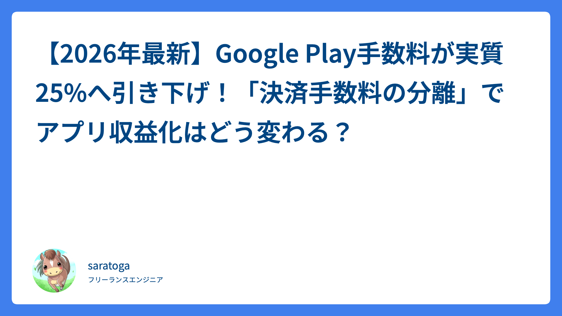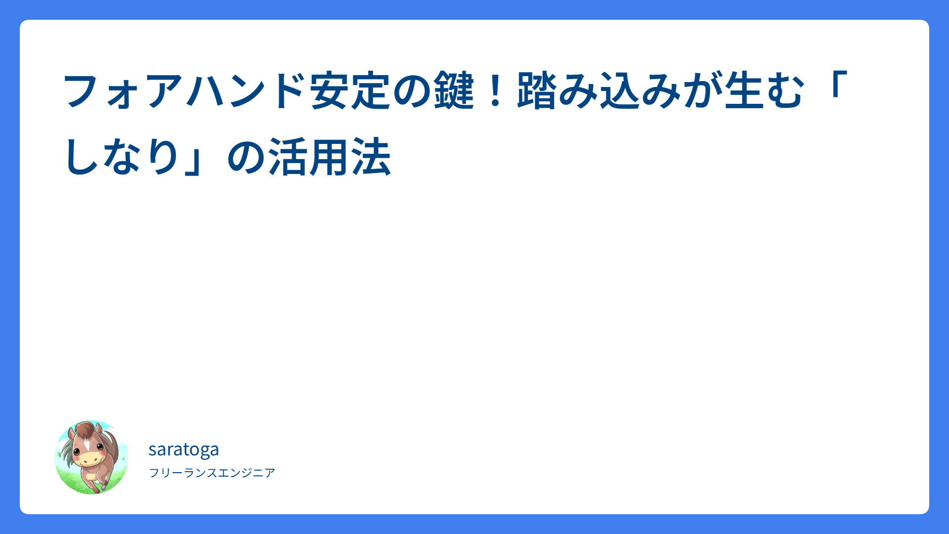 フォアハンド安定の鍵!踏み込みが生む「しなり」の活用法 2026.03.13 ストローク saratogax サラトガ牧場 【2026年最新】Google Play手数料が実質25%へ引き下げ!「決済手数料の分離」でアプリ収益化はどう変わる? 2026.03.13 技術系(Tips) saratogax サラトガ牧場 フォアスライスを武器にする!ボレー感覚で劇的に変わる3ステップ 2026.03.13 スライス(フォア・バック) saratogax サラトガ牧場 フォアハンドの距離感が合う!タイミングを優先する上達法 2026.03.12 ストローク saratogax サラトガ牧場 dd-java-agent v1.x 系アップグレード実践記:破壊的変更と解決策の全記録 2026.03.12 技術系(Tips) saratogax サラトガ牧場 フォアハンドが変わる!オープンスタンス活用術 2026.03.11 ストローク saratogax サラトガ牧場 テニス前の7分新習慣!馬場早莉プロ直伝の動的ストレッチ 2026.03.10 ウォーミングアップ saratogax サラトガ牧場 【テニス】サーブのフォルト激減!大人向け3つの安定化ステップ 2026.03.07 サーブ saratogax サラトガ牧場 フォアハンドが劇的に変わる!力みを抑えて効率よく飛ばす3つのコツ 2026.03.07 脱力 saratogax サラトガ牧場 フォアハンドは腰を回さない!股関節で飛ばす上達のコツ 2026.03.06 ストローク saratogax サラトガ牧場 もっと見る