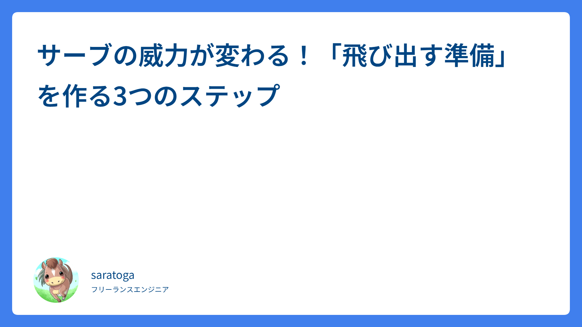 サーブの威力が変わる!「飛び出す準備」を作る3つのステップ 2026.03.20 サーブ saratogax サラトガ牧場 【決定版】テニスダブルス乱数表 5人〜8人対応(1面・2回連続休みなし・全ペア網羅) 2026.03.20 テニスコート saratogax サラトガ牧場 サーブが安定するトロフィーポーズの作り方!意外な共通点を徹底解説 2026.03.19 サーブ saratogax サラトガ牧場 サーブのしなりを作る2つの「C」!脱・手打ちで劇的パワーアップ 2026.03.19 サーブ saratogax サラトガ牧場 サーブの威力を上げる!股関節の「溜め」と脱力で打点を高くするコツ 2026.03.18 サーブ saratogax サラトガ牧場 サーブ上達の秘訣は骨にあり?肩甲骨を活かす飛ばし方のコツ 2026.03.18 サーブ saratogax サラトガ牧場 【DungeonAntiqua2】序盤〜中盤の最強スキルポイント稼ぎ!おすすめ周回スポット3選 2026.03.17 Dungeon Antiqua2 saratogax サラトガ牧場 【macOS】Homebrew で Python をアップグレードしたのに反映されない?pip install も使えない?原因と解決策を徹底解説 2026.03.17 技術系(Tips) saratogax サラトガ牧場 MySQLのLIMIT句、カンマ区切りはもう古い?SQL標準「FETCH NEXT」へ移行すべき理由とDB各社の対応状況 2026.03.17 技術系(Tips) saratogax サラトガ牧場 バックハンドスライスの打ち方!初心者がすぐ使える上達の順番 2026.03.16 スライス(フォア・バック) saratogax サラトガ牧場 もっと見る