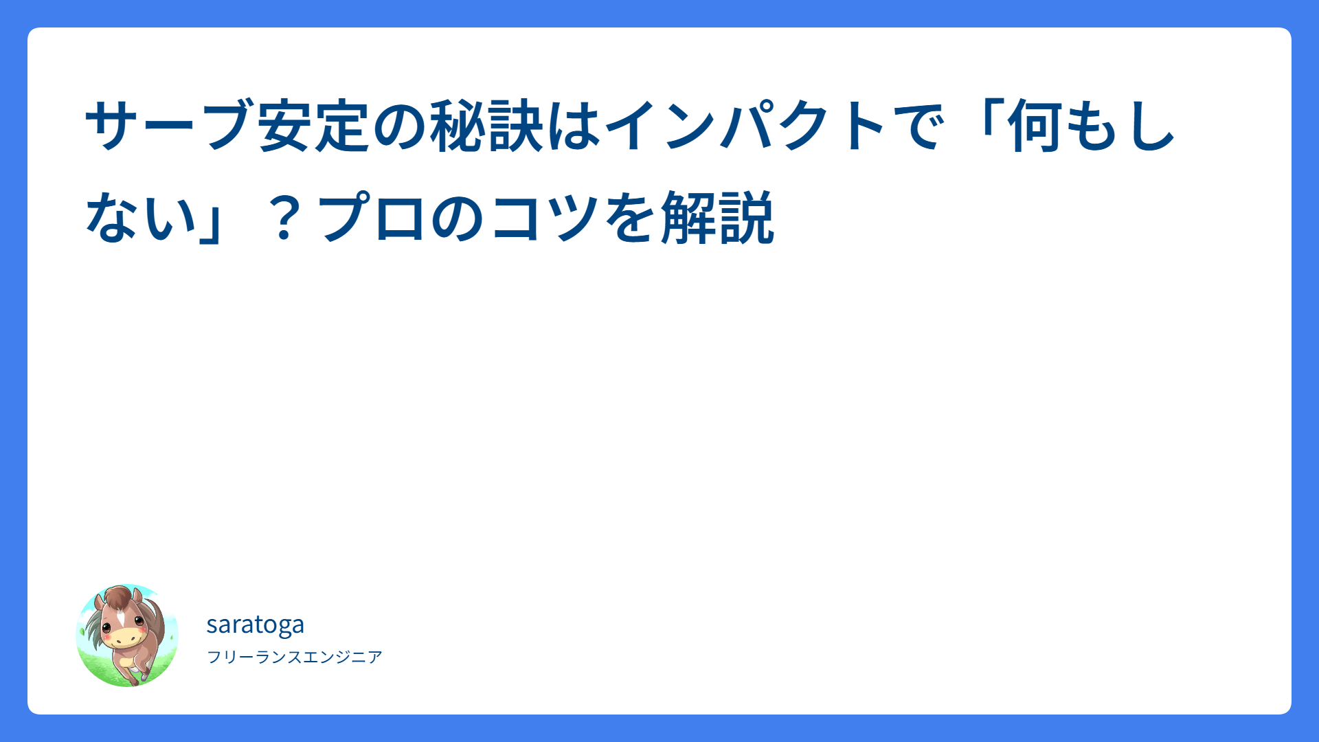 ボレーのコントロールを劇的に改善!上半身の「移動」で運ぶ極意 2026.03.27 ボレー・スマッシュ saratogax サラトガ牧場 サーブのコースと回転を両立!狙い通りに打つ2つの鉄則 2026.03.27 サーブ saratogax サラトガ牧場 サーブ安定の秘訣はインパクトで「何もしない」?プロのコツを解説 2026.03.26 サーブ saratogax サラトガ牧場 【2026年版】JIN:R×アドセンス自動広告で収益と表示速度を両立する「黄金の妥協点」とは? 2026.03.26 仕事 saratogax サラトガ牧場 ハーフボレーのコツ!足元を攻められても怖くない3つの鉄則 2026.03.25 ボレー・スマッシュ saratogax サラトガ牧場 テニスサーブのトスを安定させるコツ!小指を意識する究極の練習法 2026.03.25 サーブ saratogax サラトガ牧場 テニス・フォアハンドの極意!ガットで飛ばすグリップの握り方 2026.03.24 ストローク saratogax サラトガ牧場 サーブの威力を変える準備のコツ!「くの字」の作り方を徹底解説 2026.03.24 サーブ saratogax サラトガ牧場 yumからdnfへ!Linuxパッケージ管理の進化と移行のメリット 2026.03.24 技術系(Tips) saratogax サラトガ牧場 セカンドサーブが安定する!振り切る勇気を作る3つの上達ステップ 2026.03.23 サーブ saratogax サラトガ牧場 もっと見る