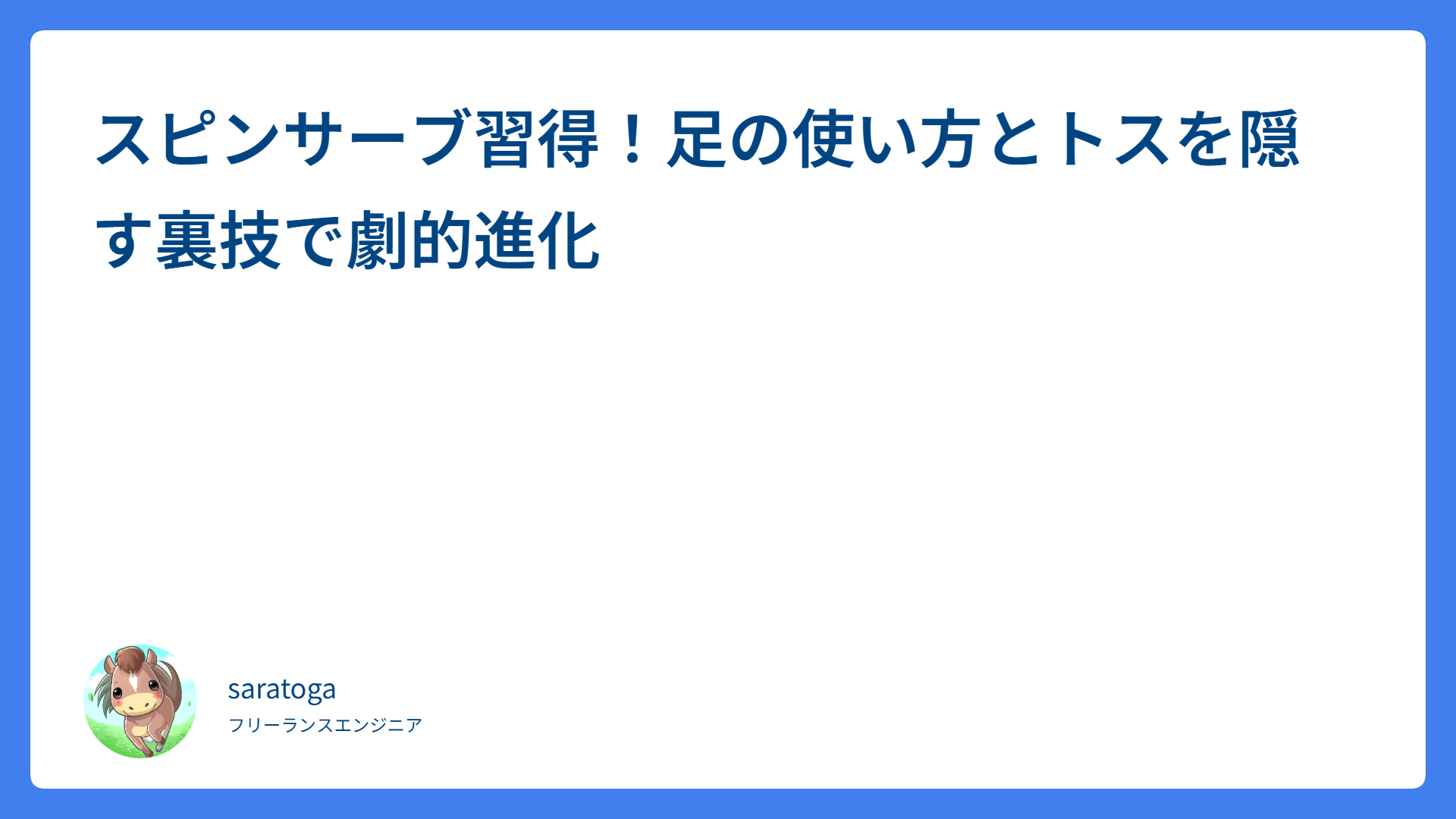 スピンサーブ習得!足の使い方とトスを隠す裏技で劇的進化 2026.04.03 サーブ saratogax サラトガ牧場 縦スライスサーブで打点を高く!簡単練習法でサーブを劇的改善 2026.04.01 サーブ saratogax サラトガ牧場 相手に主導権を握らせない!勝てるテニスの新常識「アグレッシブ・ペイシェント」とは? 2026.04.01 テニス動画レッスン saratogax サラトガ牧場 サーブの肩の痛みを解消!スライスサーブ強化と怪我防止の秘訣 2026.03.31 ケア・ウォーミングアップ saratogax サラトガ牧場 スピンサーブの壁を壊す!スライスと同じスイングで打てる秘密 2026.03.31 サーブ saratogax サラトガ牧場 PipeCD 2026年の現状と今後の移行判断 2026.03.30 技術系(Tips) saratogax サラトガ牧場 ボレー上達のコツ!プロが教える3つの練習メニューで劇的変化 2026.03.29 ボレー・スマッシュ saratogax サラトガ牧場 スピンサーブが打てない原因を解決!跳ねるサーブを習得するコツ 2026.03.29 サーブ saratogax サラトガ牧場 両手バックを安定させる極意!「お寺の鐘」に学ぶ打点のコツ 2026.03.28 ストローク saratogax サラトガ牧場 Spring Boot 3.3 から 4.0 への移行ガイド|段階的アップグレード戦略 2026.03.27 技術系(Tips) saratogax サラトガ牧場 もっと見る