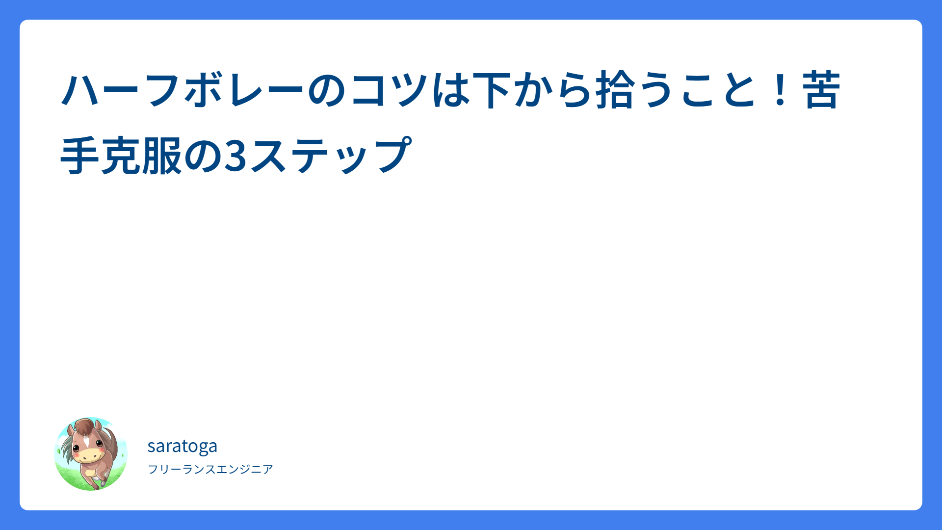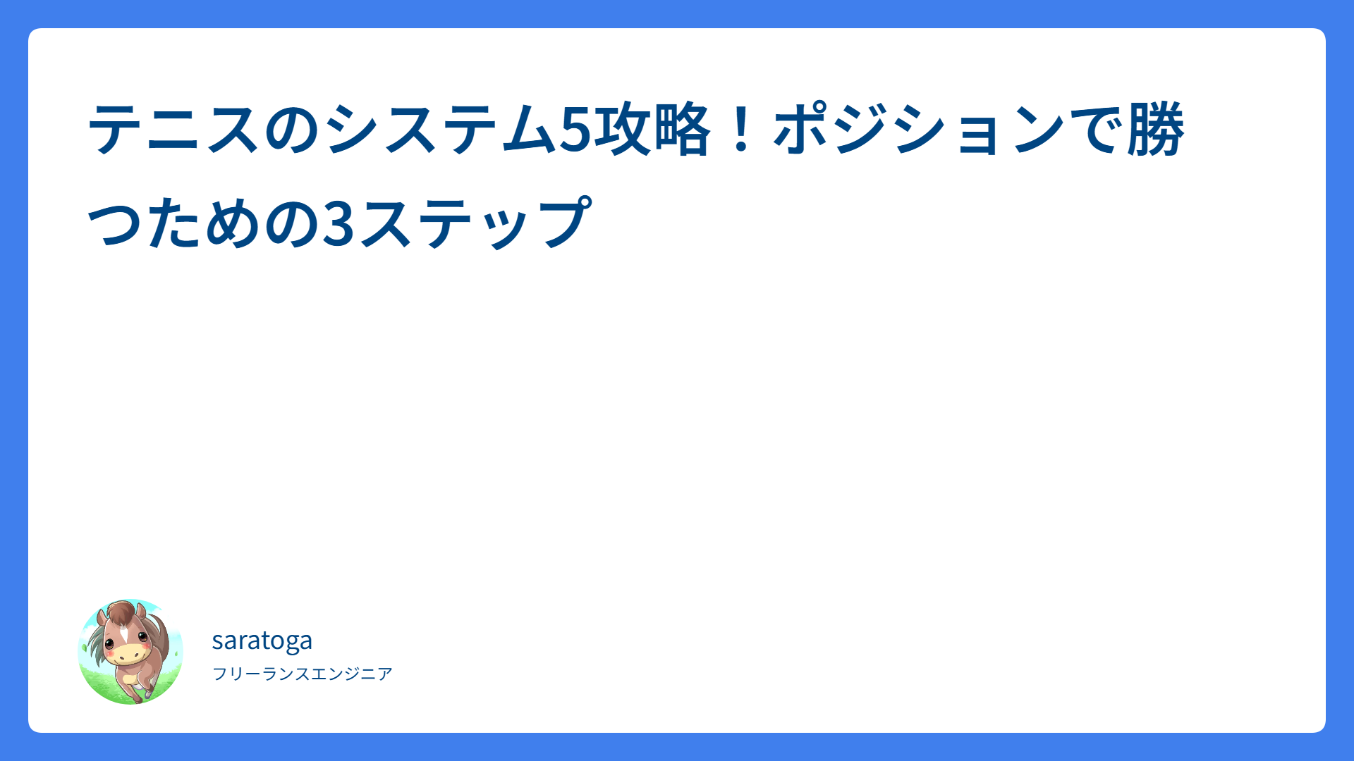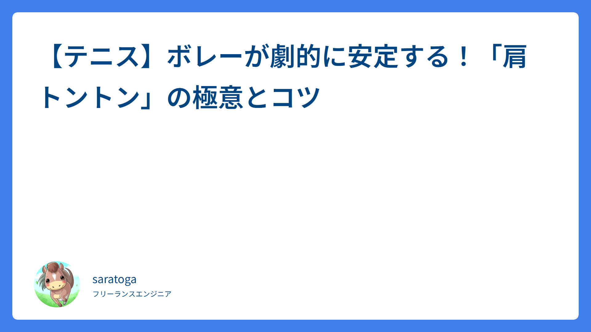 【テニス】ボレーが劇的に安定する!「肩トントン」の極意とコツ 2026.04.12 ボレー・スマッシュ saratogax サラトガ牧場 テニスのシステム5攻略!ポジションで勝つための3ステップ 2026.04.11 戦術・体の使い方 saratogax サラトガ牧場 ハーフボレーのコツは下から拾うこと!苦手克服の3ステップ 2026.04.11 ボレー・スマッシュ saratogax サラトガ牧場 ボールを押し出す感覚を掴む!強打を安定させる3ステップ【テニス】 2026.04.11 ストローク saratogax サラトガ牧場 男子ダブルス勝率UP!ボレーの攻防とセンターを死守する立ち回り 2026.04.10 戦術・体の使い方 saratogax サラトガ牧場 ダブルス上級者への第一歩!決まるボレーと足運びの重要ポイント 2026.04.10 戦術・体の使い方 saratogax サラトガ牧場 AWS Load Balancer Controller v2.4系からのアップグレード完全ガイド 2026.04.09 技術系(Tips) saratogax サラトガ牧場 テニスでスピンをかけるコツは2つ!安定して収める実践ステップ 2026.04.08 ストローク saratogax サラトガ牧場 楽に鋭い球を打つ!テニスの「パワームーブ」でショットが激変 2026.04.08 戦術・体の使い方 saratogax サラトガ牧場 GitHub Actions の PR 作成を gh CLI に移行した話 2026.04.08 技術系(Tips) saratogax サラトガ牧場 もっと見る