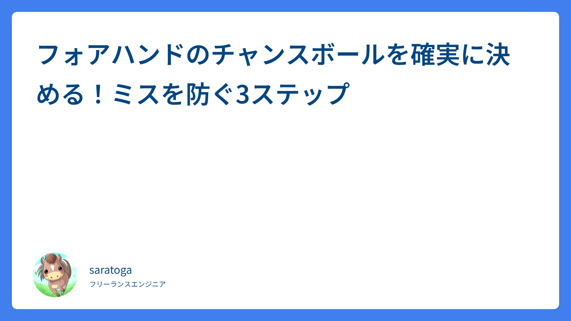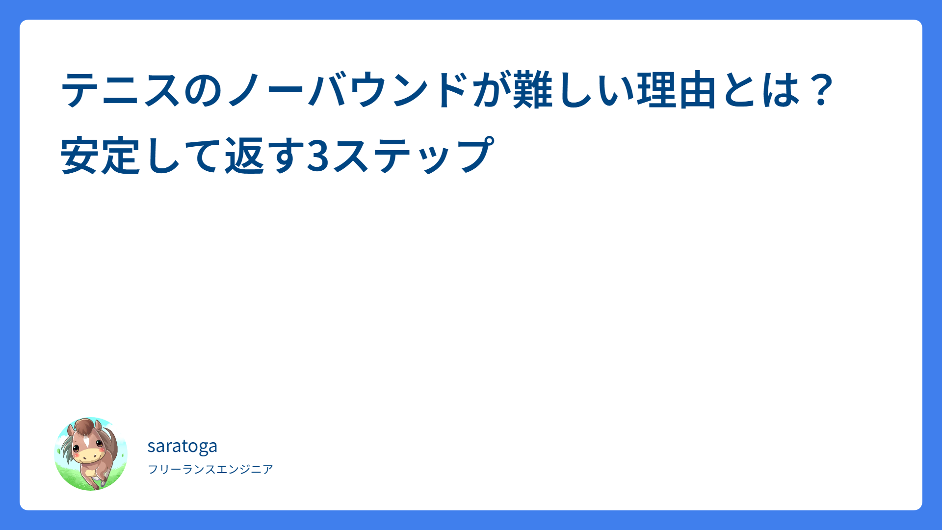 テニスのノーバウンドが難しい理由とは?安定して返す3ステップ 2026.04.12 ストローク saratogax サラトガ牧場 フォアハンドのチャンスボールを確実に決める!ミスを防ぐ3ステップ 2026.04.12 戦術・体の使い方 saratogax サラトガ牧場 【テニス】ボレーが劇的に安定する!「肩トントン」の極意とコツ 2026.04.12 ボレー・スマッシュ saratogax サラトガ牧場 テニスのシステム5攻略!ポジションで勝つための3ステップ 2026.04.11 戦術・体の使い方 saratogax サラトガ牧場 ハーフボレーのコツは下から拾うこと!苦手克服の3ステップ 2026.04.11 ボレー・スマッシュ saratogax サラトガ牧場 ボールを押し出す感覚を掴む!強打を安定させる3ステップ【テニス】 2026.04.11 ストローク saratogax サラトガ牧場 男子ダブルス勝率UP!ボレーの攻防とセンターを死守する立ち回り 2026.04.10 戦術・体の使い方 saratogax サラトガ牧場 ダブルス上級者への第一歩!決まるボレーと足運びの重要ポイント 2026.04.10 戦術・体の使い方 saratogax サラトガ牧場 AWS Load Balancer Controller v2.4系からのアップグレード完全ガイド 2026.04.09 技術系(Tips) saratogax サラトガ牧場 テニスでスピンをかけるコツは2つ!安定して収める実践ステップ 2026.04.08 ストローク saratogax サラトガ牧場 もっと見る