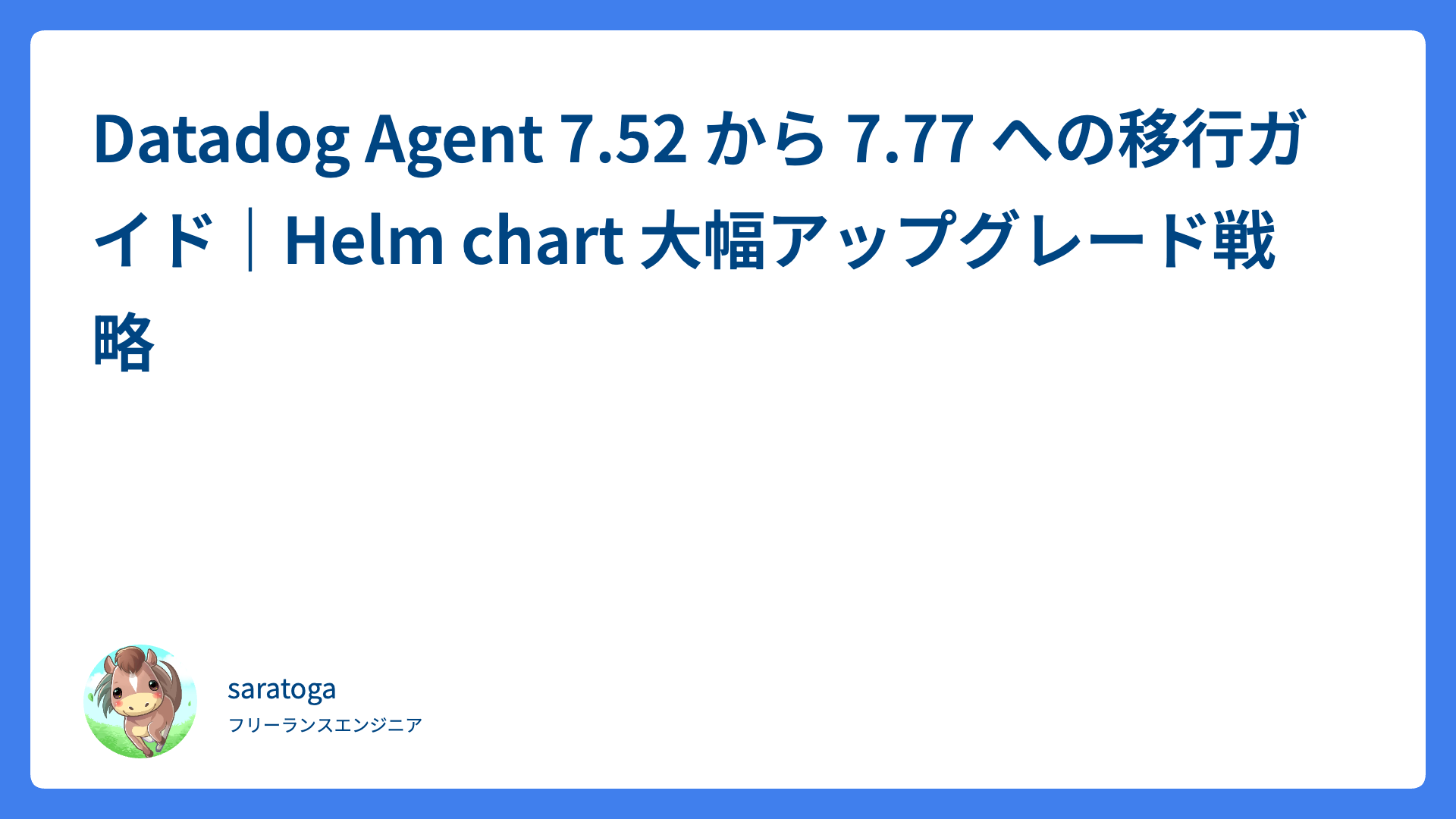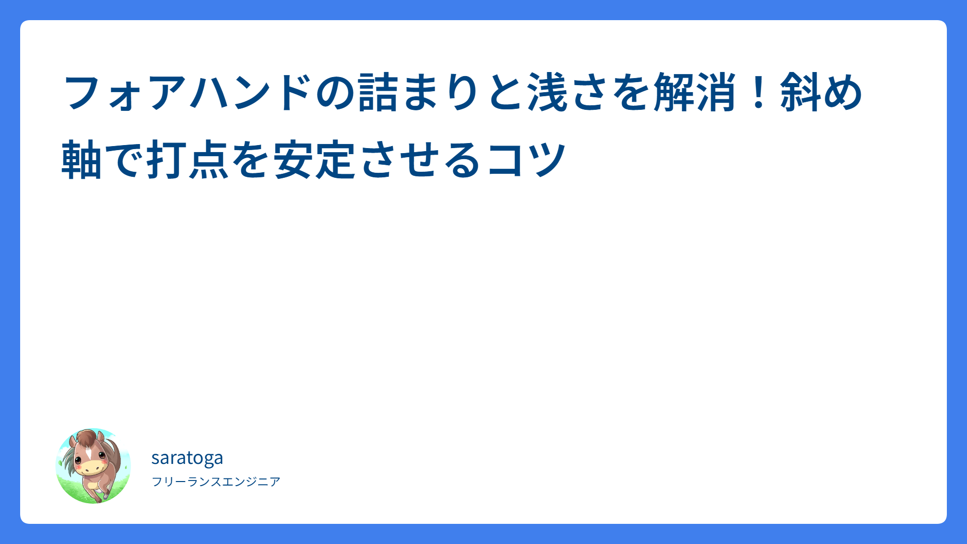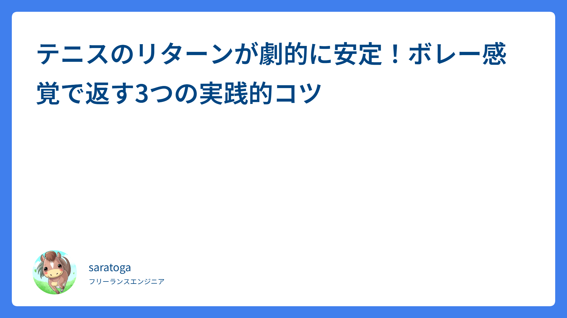 テニスのリターンが劇的に安定!ボレー感覚で返す3つの実践的コツ 2026.04.15 リターン・レシーブ saratogax サラトガ牧場 フォアハンドの詰まりと浅さを解消!斜め軸で打点を安定させるコツ 2026.04.15 ストローク saratogax サラトガ牧場 Datadog Agent 7.52 から 7.77 への移行ガイド|Helm chart 大幅アップグレード戦略 2026.04.15 技術系(Tips) saratogax サラトガ牧場 脱・手打ち!小野田プロに学ぶ「リスト活用」で激変するフォアハンド 2026.04.15 ストローク saratogax サラトガ牧場 フットワークが劇的に改善!プロ推奨「踏み込み」練習で足が動く 2026.04.15 戦術・体の使い方 saratogax サラトガ牧場 ヨネックスMUSE(ミューズ)最速レビュー!楽に飛ぶ新感覚ラケット 2026.04.15 テニスアイテム saratogax サラトガ牧場 スマッシュの苦手克服!簡単なコツと難しい球の対処法をプロが伝授 2026.04.12 ボレー・スマッシュ saratogax サラトガ牧場 フォアがかすれる…「チョリチョリ」を卒業して厚い当たりを打つコツ 2026.04.12 ストローク saratogax サラトガ牧場 テニスのノーバウンドが難しい理由とは?安定して返す3ステップ 2026.04.12 ストローク saratogax サラトガ牧場 フォアハンドのチャンスボールを確実に決める!ミスを防ぐ3ステップ 2026.04.12 戦術・体の使い方 saratogax サラトガ牧場 もっと見る