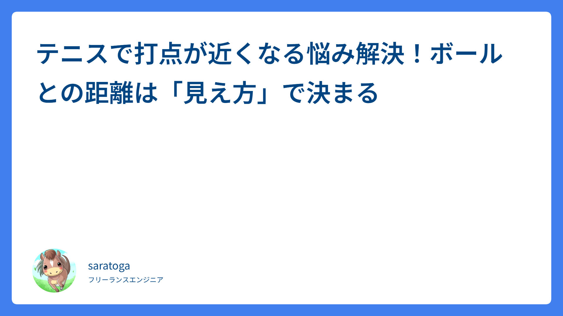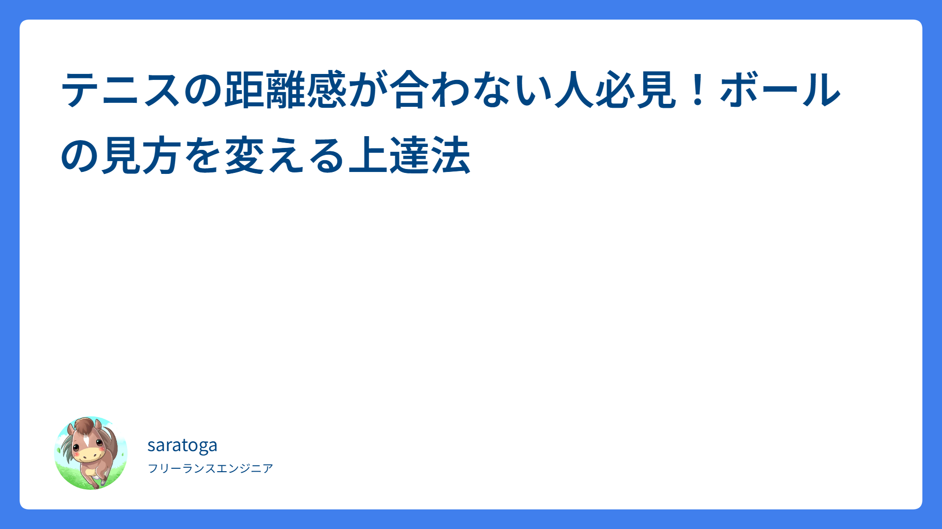 TAG 大人のてにす部 テニスで打点が近くなる悩み解決!ボールとの距離は「見え方」で決まる 2026.04.06 戦術 saratogax サラトガ牧場 相手に主導権を握らせない!勝てるテニスの新常識「アグレッシブ・ペイシェント」とは? 2026.04.01 テニス動画レッスン saratogax サラトガ牧場 テニス・フォアハンドの極意!ガットで飛ばすグリップの握り方 2026.03.24 ストローク saratogax サラトガ牧場 フォアハンドスライスの打ち方|ボレー感覚でミスを減らす3ステップ 2026.03.13 スライス(フォア・バック) saratogax サラトガ牧場 スプリットステップのコツ!反応が遅れる悩みを解決する3つのステップ 2026.03.02 戦術 saratogax サラトガ牧場 テニスの距離感が合わない人必見!ボールの見方を変える上達法 2026.02.06 ストローク saratogax サラトガ牧場