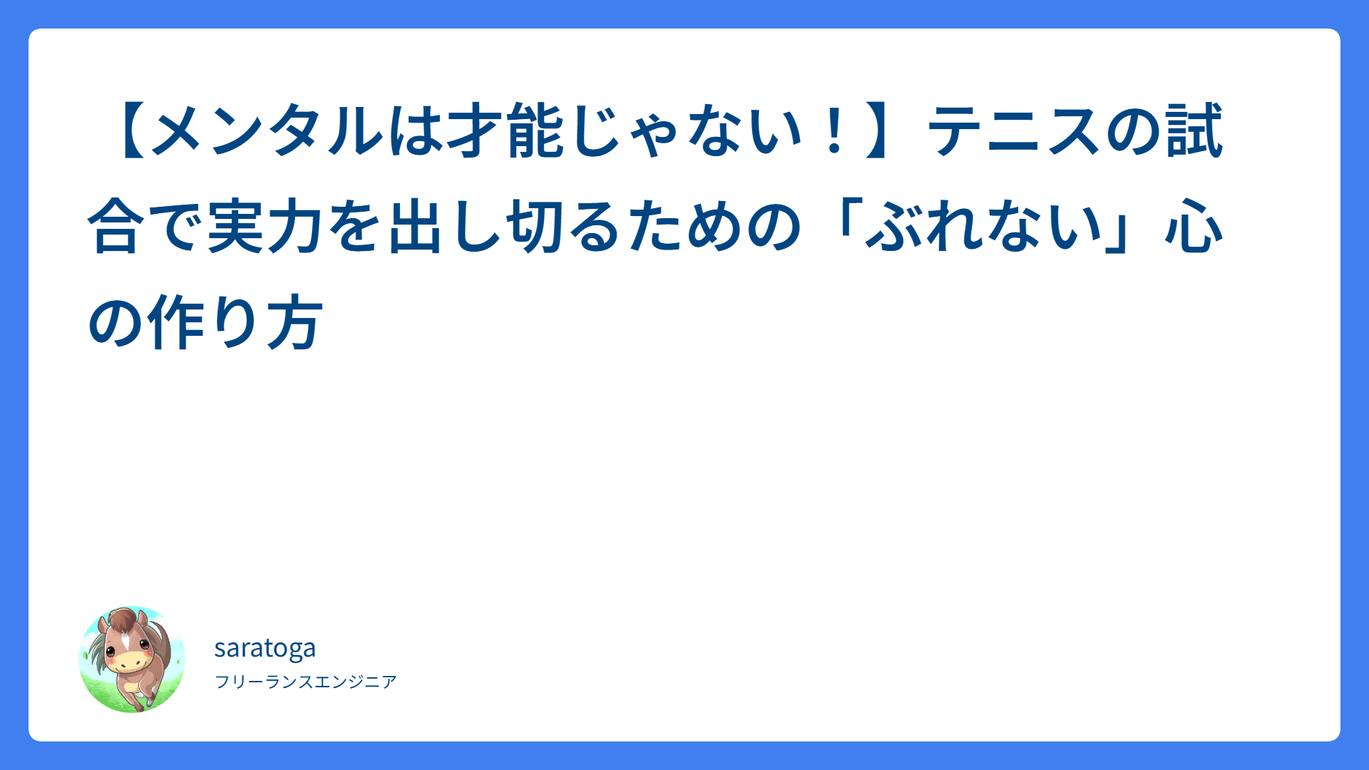 CATEGORY 戦術(ダブルス、ポーチ) 【メンタルは才能じゃない!】テニスの試合で実力を出し切るための「ぶれない」心の作り方 2026.02.11 戦術(ダブルス、ポーチ) saratogax サラトガ牧場 【メンタル革命】テニスの試合で勝てないのは「言葉」のせい?世界一を支えた「最強のメンタル」の作り方 2026.02.11 戦術(ダブルス、ポーチ) saratogax サラトガ牧場 【ダブルス必見】センターロブの処理で迷わない!ペアとの連携を深める「鉄則」と「カバーのコツ」 2026.02.03 戦術(ダブルス、ポーチ) saratogax サラトガ牧場 テニスIQが劇的に上がる!「システム5」で試合の判断ミスをなくす方法 2026.02.03 戦術(ダブルス、ポーチ) saratogax サラトガ牧場 【ダブルス必見】ポーチに出られても諦めない!確率論で守備力を劇的に変える「コース予測のセオリー」 2026.01.30 戦術(ダブルス、ポーチ) saratogax サラトガ牧場 【脱・苦手意識】並行陣を崩す2つの鉄則!足元への沈めとロブの使い分け術 2026.01.29 戦術(ダブルス、ポーチ) saratogax サラトガ牧場 フットワークの常識が変わる!横に振られた時こそ「斜め前」に動くべき理由 2026.01.28 戦術(ダブルス、ポーチ) saratogax サラトガ牧場 シコラー対策の救世主!「スニークイン」をマスターして効率よくポイントを奪う方法 2026.01.26 戦術(ダブルス、ポーチ) saratogax サラトガ牧場 「ミスしない」と願うほどミスが増える!?脳の仕組みを逆手に取った、試合で勝てるメンタル術 2026.01.26 戦術(ダブルス、ポーチ) saratogax サラトガ牧場 ポーチの成功率が劇的に変わる!「飛びつかない」勇気と「目線」の使い分け術 2026.01.23 戦術(ダブルス、ポーチ) saratogax サラトガ牧場 もっと見る