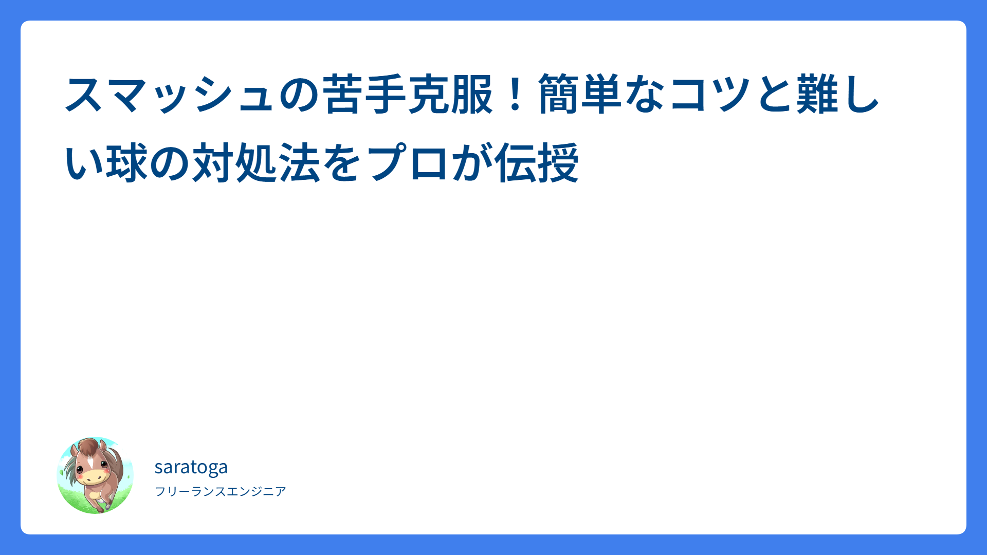 CATEGORY ボレー・スマッシュ スマッシュの苦手克服!簡単なコツと難しい球の対処法をプロが伝授 2026.04.12 ボレー・スマッシュ saratogax サラトガ牧場 【テニス】ボレーが劇的に安定する!「肩トントン」の極意とコツ 2026.04.12 ボレー・スマッシュ saratogax サラトガ牧場 ハーフボレーのコツは下から拾うこと!苦手克服の3ステップ 2026.04.11 ボレー・スマッシュ saratogax サラトガ牧場 「バックハイボレー」克服!プロが教える安定感を高める3つのポイント 2026.04.07 ボレー・スマッシュ saratogax サラトガ牧場 ボレーを押し込むコツ!当てるだけを卒業して攻める3ステップ 2026.04.07 ボレー・スマッシュ saratogax サラトガ牧場 テニスボレー|ネット前・スマッシュの記事一覧 2026.04.05 ボレー・スマッシュ saratogax サラトガ牧場 ボレーの凡ミス激減!緩い球を確実に仕留める足元の極意 2026.04.03 ボレー・スマッシュ saratogax サラトガ牧場 ボレー上達のコツ!プロが教える3つの練習メニューで劇的変化 2026.03.29 ボレー・スマッシュ saratogax サラトガ牧場 ボレーのコントロールを劇的に改善!上半身の「移動」で運ぶ極意 2026.03.27 ボレー・スマッシュ saratogax サラトガ牧場 ハーフボレーのコツ!足元を攻められても怖くない3つの鉄則 2026.03.25 ボレー・スマッシュ saratogax サラトガ牧場 もっと見る